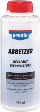 Abbeizer presto 750 mlpresto Abbeizer löst schnell und porentief mehrere Schichten in einem Arbeitsgang. Gebrauchsfertig, geruchsmild, haftet sehr gut an senkrechten Flächen. Zur Entfernung von alten Lack- und Farbschichten auf Öl-, Nitro- und Kunstharzbasis, Polituren, Mattierungen, Latex- und Dispersionsfarben, Alkydharz, Kunststoffputze und Klebstoffreste, Spachtelmasse und PU-Schaumreste von allen gängigen Untergründen wie Stein, Holz oder Metall.Qualität und Eigenschaften:Entfernt schnell und gründlich alte Farben und LackeGebrauchsfertig, geruchsmild, haftet sehr gut an senkrechten Flächen