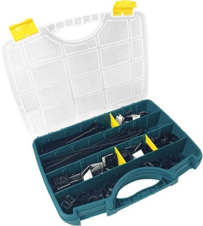 Kabelbinder-Sortiment 350-teilig, im KofferPraktisches Klebesockel- und Kabelbinder-Sortiment im Kunststoffkoffer. Kabelbinder aus Nylon, selbstlöschend, entsprechend der Norm UL94V-2, innerhalb von max. 30 Sekunden. Hohe Flexibilität auch bei starken Temperaturschwankungen, weitgehend chemikalienbeständig und überdurchschnittlich farbbeständig. Zum Befestigen und Bündeln von Schläuchen, Kabeln und Leitungen.