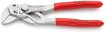 Zangenschlüssel KNIPEX kunststoffüberzoge Griffe, 125 mmKnipex 8603/8605, DIN ISO 5743, Chrom-Vanadin-Elektrostahl, geschmiedet, ölgehärtet, verchromt. Glatte, parallel geführte Greifbacken, stufenlose Schlüsselweiteneinstellung, Einstellung per Knopfdruck direkt am Werkstück, 10-fache Handkraftverstärkung durch Nockenantrieb.Verstellbares Schraubwerkzeug, der Hub zwischen den Greifbacken ermöglicht ein schnelles Anziehen und Lösen von Schraubverbindungen nach dem Ratschenprinzip; ersetzt einen kompletten Satz Maulschlüssel, metrisch wie zöllig.