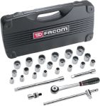 Zwölfkant-Steckschlüsselsatz FACOM 1/2" / 25-teilig / S.161-4P12Facom S.161-4P12, Chrom-Vanadium-Stahl, verchromt, in Kunststoffetui, enthaltend:20 Zwölfkant-Steckschlüsseleinsätze SW 10...32 mm1 Gleitgriff2 Verlängerungen 130, 250 mm1 Kardangelenk1 Umschaltknarre S.161B