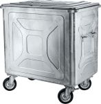 Kehrichtcontainer OCHSNER 800 lpassend zu allen genormten Kehrichtabfuhrwagen, aus Stahlblech, feuerverzinkt, 4 Lenkrollen mit Stahlfelgen, 1 Bremse, 1 Richtungsfeststeller, eingebauter Deckelheber. Einfüllmenge: bis 20 Säcke à 35 l.