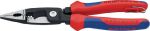 Elektro-Installationszange KNIPEX 13 82 200, 200 mmKnipex 1382, Spezial-Werkzeugstahl, geschmiedet, ölgehärtet, Präzisionsschneiden zusätzlich induktiv gehärtet, schwarz atramentiert, Kopf poliert, Griffe mit Mehrkomponenten-Hüllen. 6 Funktionen in einer Zange: glatte Greifflächen an der Spitze für beschädigungsfreies Greifen von Einzeladern; profilierte Greifflächen und Brennerloch für Flach- und Rundmaterial; markante Aussenkante an der Backe zum Bearbeiten von Unterputzdosen und Entgraten von Durchführungslöchern; Abisolierlöcher für Leiter 0.75 - 1.5 mm2 und 2.5 mm2; Crimpnest für Aderendhülsen 0.5 - 2.5 mm2; Kabelschere für Cu- und Al-Kabel bis 5 x 2.5 mm2 / Ø 15 mm. Geschraubtes Gelenk, präziser, spielfreier Gang der Zange.