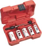 Set di seghe a tazza MILWAUKEE HOLE DOZER HOLE DOZER, 7 pezzi, Ø 19...32 mmTecnologia della punta per una durata ineguagliabile. Geometria del dente - Dentatura variabile 4 - 6 TPI Vario con angolo positivo del dente di 10°: - Tagli più veloci e aggressivi. - Minore generazione di calore per una maggiore durata del dente. - Maggiore profondità del dente per una migliore rimozione del materiale. - I denti appositamente sagomati riducono gli inceppamenti nei materiali sottili. - Il passo dei denti impostato riduce l'attrito. - Minore pressione di contatto necessaria grazie alla dentatura aggressiva e alla buona rimozione del materiale.