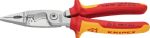 Pinze per installazioni elettriche KNIPEX 13 86 200, 200 mmKnipex1386, acciaio speciale per utensili, forgiato, temperato ad olio, taglienti di precisione, inoltre temperato ad induzione, cromato, manici con impugnature multicomponente. 6 funzioni in un'unica pinza: superfici di presa lisce in punta per la presa senza danni di singoli fili; superfici di presa profilate e foro di bruciatura per materiale piatto e rotondo; bordo esterno caratteristico della ganascia per lavorare su prese a filo e sbavare i fori di passaggio; fori di spelatura per conduttori da 0. 75 a 1,5 mm² e per conduttori da 1,5 mm².75 - 1,5 mm² e 2,5 mm²; nido di crimpatura per puntali 0,5 - 2,5 mm²; cesoie per cavi in rame e alluminio fino a 5 x 2,5 mm² / Ø 15 mm. Giunto avvitato, design sottile, molla di apertura, meccanismo di bloccaggio intelligente con lama di bloccaggio, mantiene chiusi i taglienti mantenendo le altre funzioni. Isolata a 1000 volt, testata VDE, conforme alla norma DIN EN 60900.